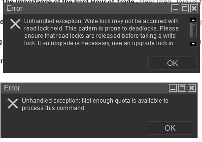 The second message means the process (NInjTrader) has run out of PC memory. Do you get this consistently or only randomly when other applications are open? Please also make sure there is at least 2GB of paging file memory set up on your Windows installation: