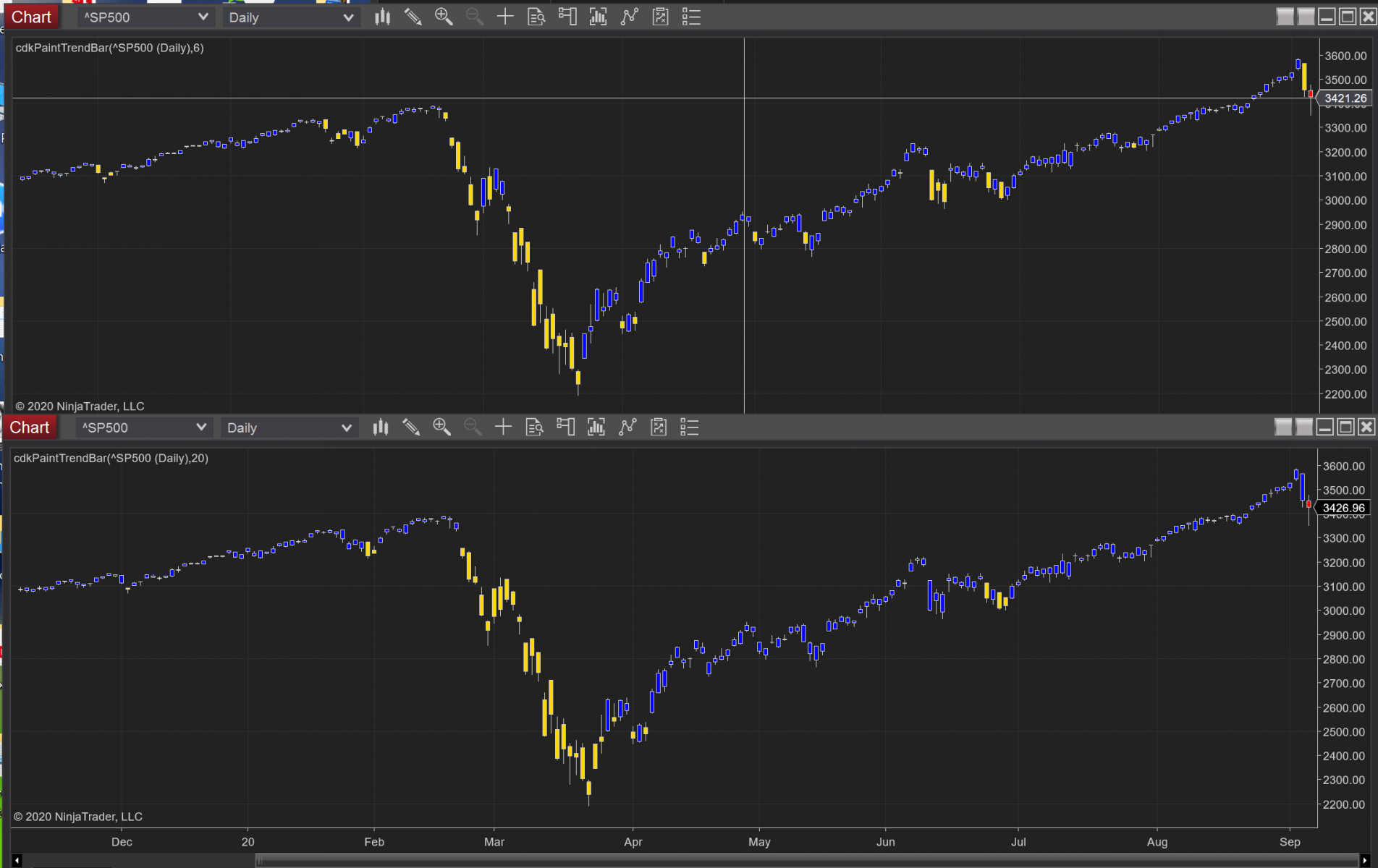 Generally, the more bars you use the longer the trend remains. The less bars you use the more frequent changes of the trend. Likewise, the more ATR (say 1 or 100%) applied the less changes of the trend. I attached a screenshot with looking back bars set at 6 and 20, respectively. ATR was 0.5 for both.
