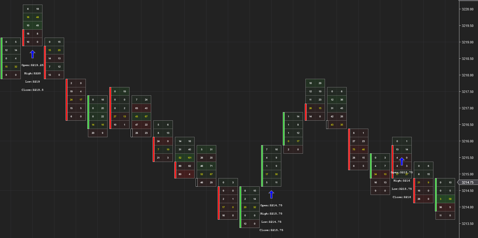 Attached is a 4 range volumetric chart for the ES 12-20. I programmatically retrieved Open[0], High[0], Low[0], and Close[0] information and then printed below the bar. Each of the bars with an arrow should be green according to the OHLC info, but appear red. The arrow and text are only displayed where Close[0] > Open[0]. Do you have any suggestions for resolving this discrepancy? The indicator calculates OHLC onbarclose. The bar on the bottom right has a close of 3216 which does not make sense when looking at the next bar to the right.