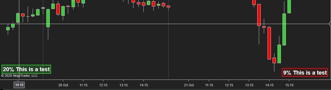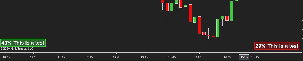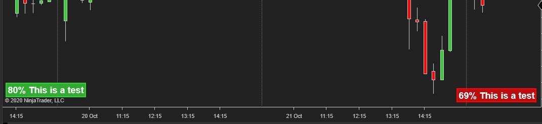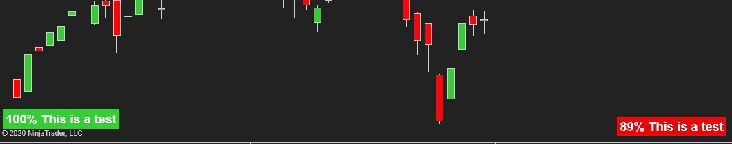 I can barely see the opacity with 90 but its there, very difficult to tell so a range of 10 - 90 would be best for the visible range.Code:Draw.TextFixed(this, "Test", "TEST", TextPosition.Center, Brushes.White, new SimpleFont(), Brushes.Red, Brushes.Red, 90);