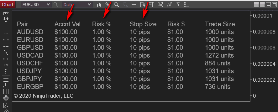 So the logic for the indie loads in the necessary data series to calculate position size for ANY pair(to include non-USD crosses). Right now, the inputs are shown, and that is that the user enters an account value, the desired risk percent, and a stop size. It then spits out the dollars risked(2nd to last column) and the required trade size(last column).