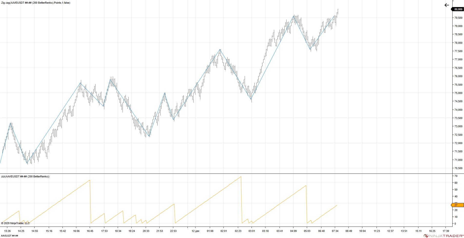 ZigZag (2percent) and indicator with ZigZag(Close,DeviationType.Percent,2,false).LowBar (0, 1,1000) plotted