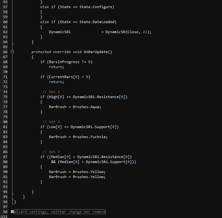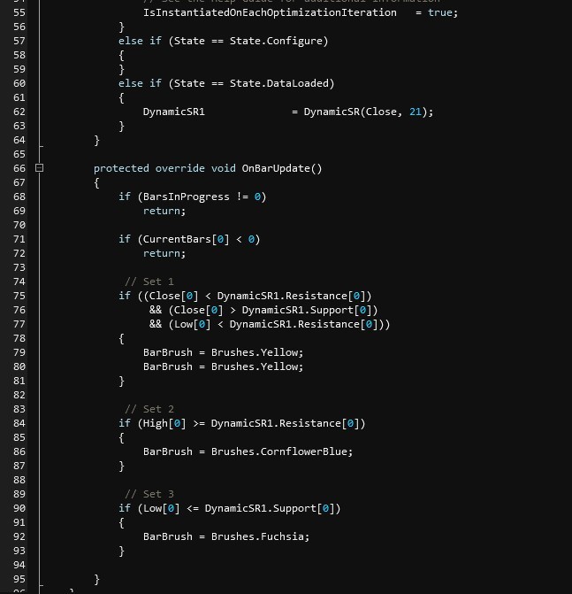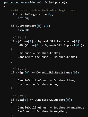 This would also need to be done for the Support[0] plot to change the bar color to magenta when the current Close[0] is less than the Support[0] plot.Code:protected override void OnBarUpdate() { if (Close[0] > Resistance[0]) BarBrush = Brushes.Blue; }