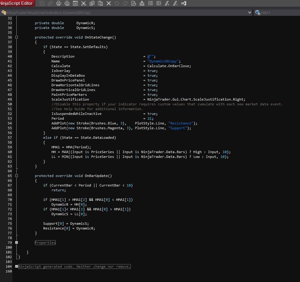 If you are wanting to create a modified version of the DynamicSR indicator, you could download and import the DynamicSR indicator followed by modifying the indicator in a New > NinjaScript Editor window. To do so, you would open a New > NinjaScript Editor window, double-click the Indicators folder, then select the DynamicSR indicator. Right-click in the indicator's code and click 'Save as' to create a copy of the DynamicSR indicator.