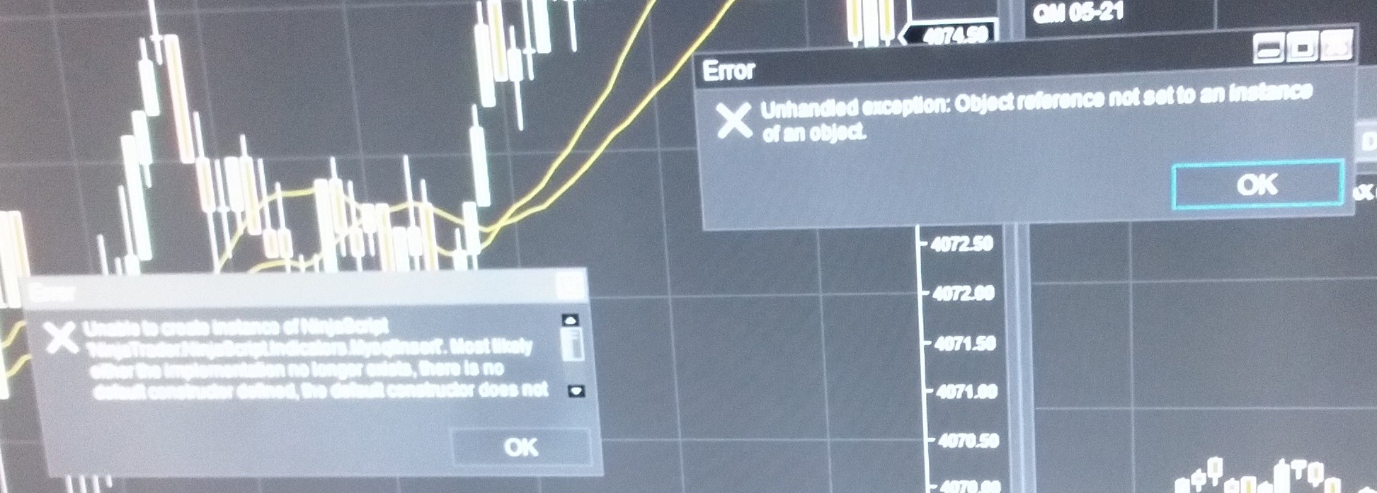 The indicator is using an SQL package and the issue is likely coming from that. The error is that you are accessing an object that has not yet been initialized. I assume the SQL code is not working or not initialized properly. Use Visual Studio debugging to attach to the NinjaTrader process and see what line is causing the unhandled exception: