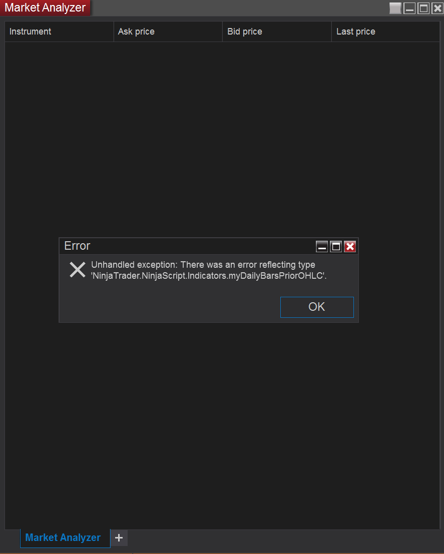 Unhandled Exception: There was an error reflecting Type 'NinjaTrader.Ninjascript.MyDailyBarsPriorOHLC'.