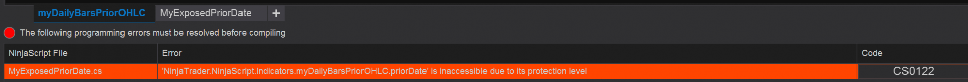 I checked trying to compile again and the error CS0122 'Ninjatrader.Ninjascript.Indicators.myDailyBarsPri orOHLC.priorDate' is inaccessible due to its protection level is not solved: