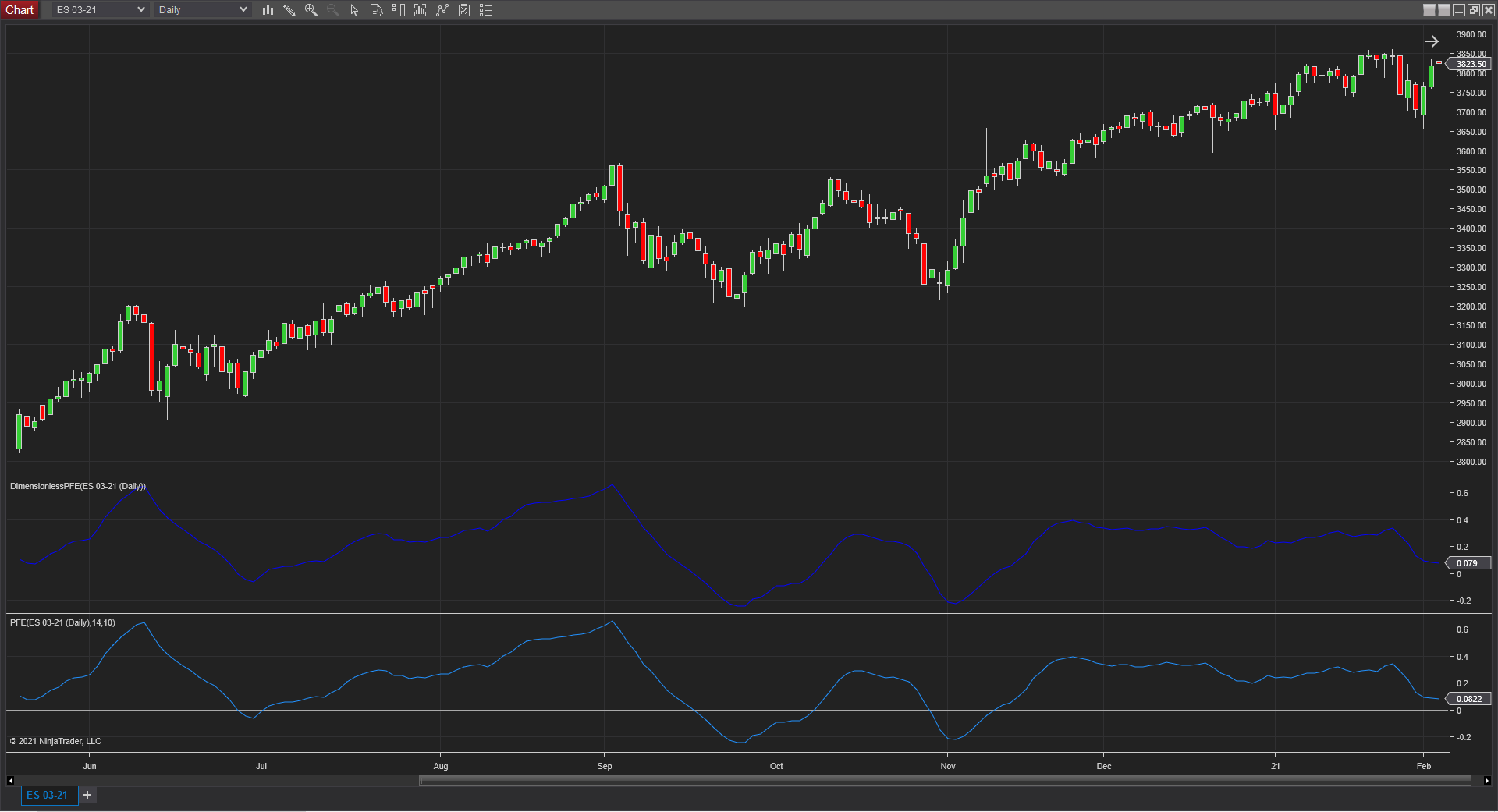 Description = @"The DimensionlessPFE (Polarized Fractal Efficiency) is an indicator that uses fractal geometry to determine how efficiently the price is moving.";