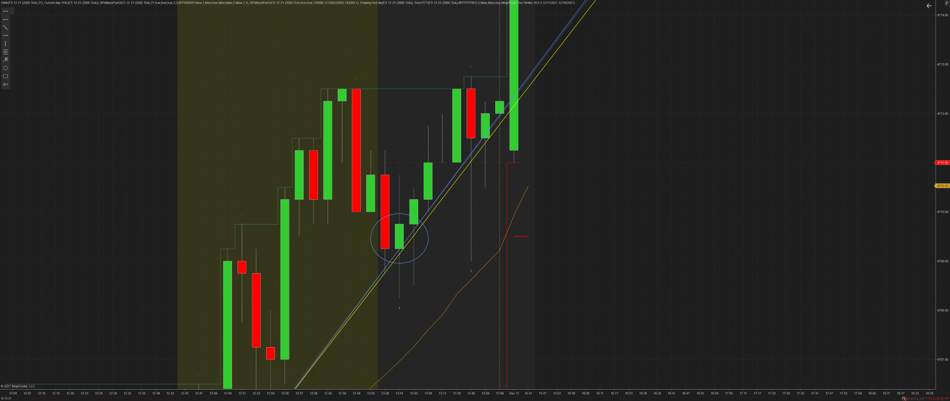 That's a bit tricky, you'd need to calculate exactly at what price the yellow line crosses the center of the bar and use that as your Y2 value instead of what you're using for the blue line, there wouldn't be a way to just snap the blue line to the corner of the bar.