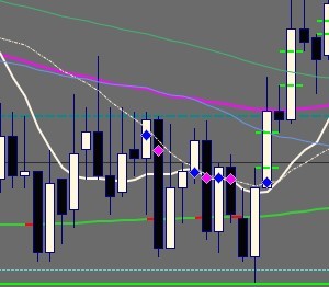 here's an example of the event I'm looking to verify. you can see the cluster of blue and pink triangles where there was a relatively high frequency of sma crosses over a small number of bars. I'm trying to make a simple 1 or 0 heads-up indicator so that i can track this type of event over a number of instruments in the data analyzer