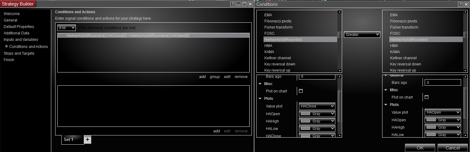 When you select the indicator in the Strategy builders condition window, you must select the 'Value plot" to use for that condition, so on one side you would select the indicator and the value plot of "HAClose" and on the other side you would select the same indicator but this time the value plot of "HAOpen". Between them you select the logic condition of greater or Less, as needed.