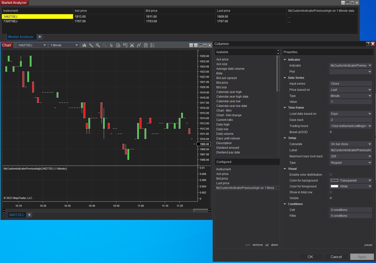 I would like to determine whether the first 1 minute leg of the previous day was positive or negative and display that in the market analyzer.