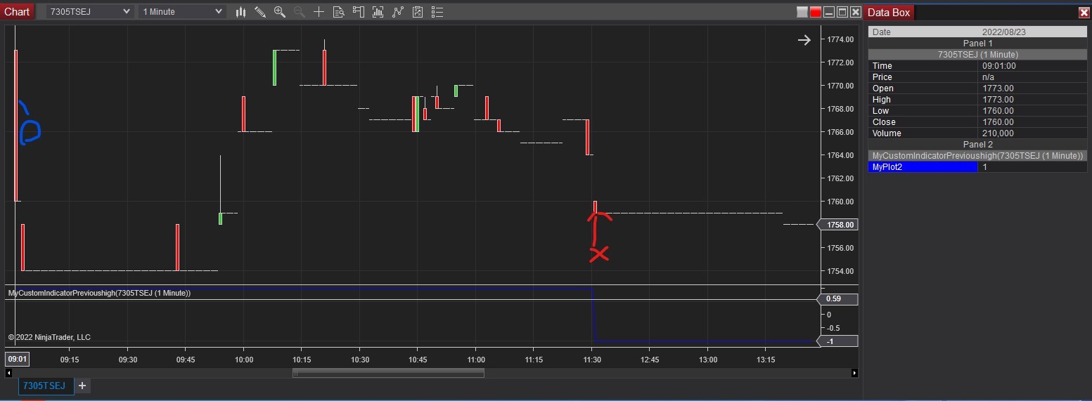 This is simplified because I am not sure what bars type you are planning to run this on. If you were using 1 minute bars and Calculate OnBarClose then you could surround the condition setting currentDayValue with Bars.IsFirstBarOfSession. The first closed bar of the session would be the first 1 minute in that specific use case. If you are using other bars types the logic for finding the first 1 minute would be more complex because you would need to create time conditions.Code:private double priorDayValue; private double currentDayValue; protected override void OnBarUpdate() { if(Bars.IsFirstBarOfSession) { priorDayValue = currentDayValue; } Value[0] = priorDayValue; //logic to find first minute value or whatever logic you wanted if(Close[0] < Open[0]) { currentDayValue = -1; } else if(Close[0] > Open[0]) { currentDayValue = 1; } }