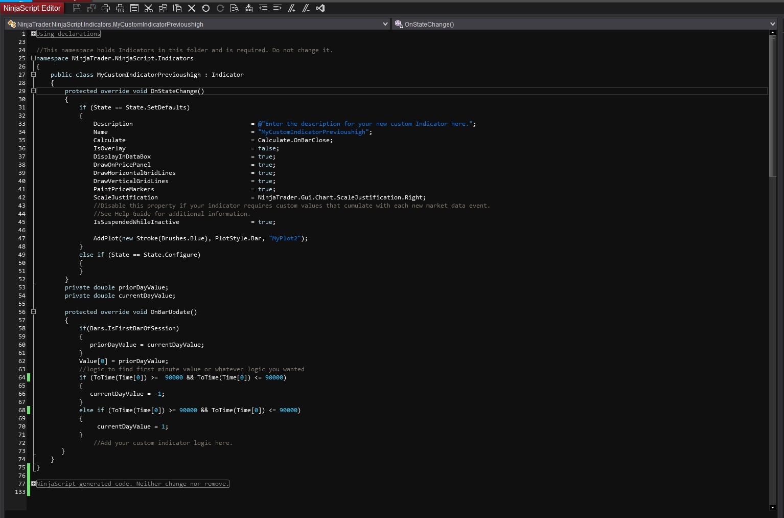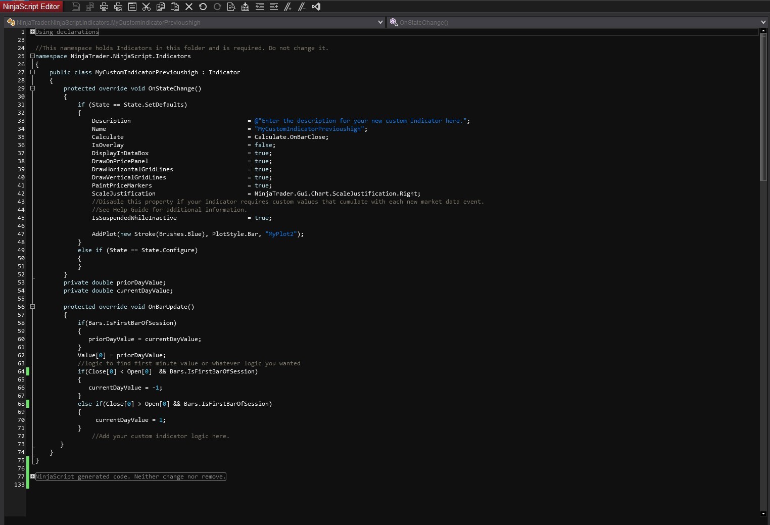 Code:if(Bars.IsFirstBarOfSession) { priorDayValue = currentDayValue; }