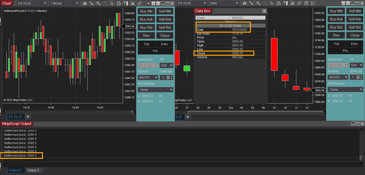 How can I access the settlement price or what data field does the chart access for the closing price for daily candles?