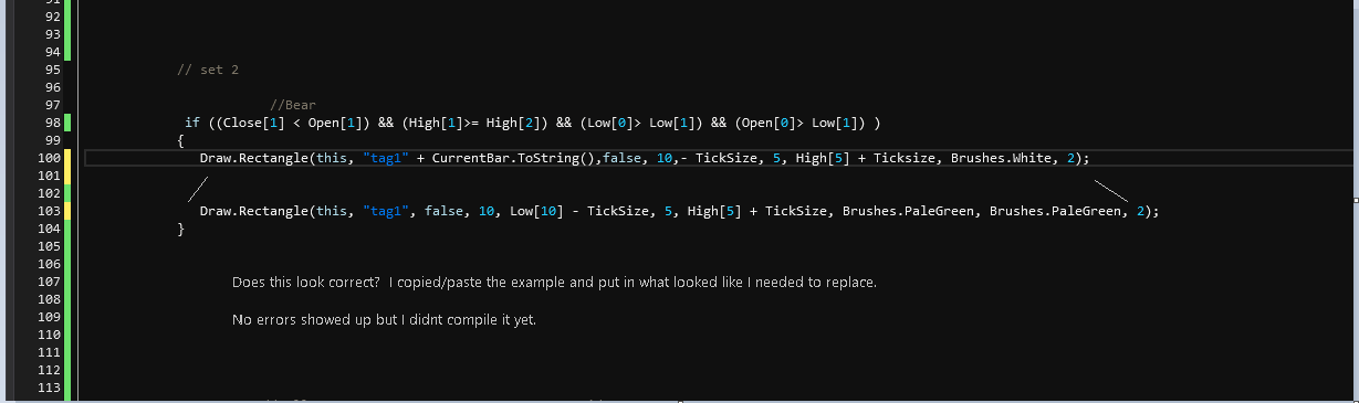 Yesterday I forgot to put ... if ((Close[1] < Open[1]) && (Low[0]>= Low[1]) && High[0]<High[1] && (Close[0]>Open[0]) )