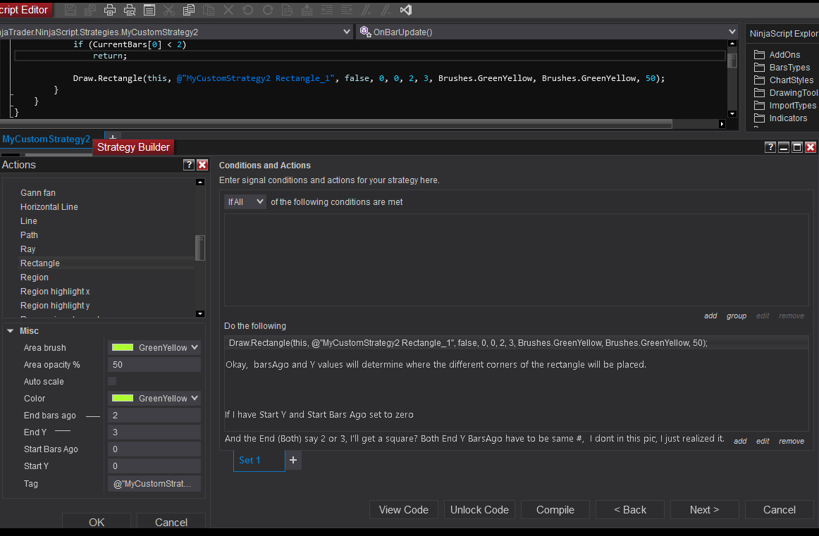 In order to explore the different adjustments for rectangles, I suggest opening up a test script in the Strategy Builder (Control Center > New > Strategy Builder). This is similar to the advice I provided in post #2 of this thread. Next, you can go to the conditions and actions screen and set an action to draw a rectangle. The interface will allow you to adjust things like color and opacity, and then the start/end barsAgo and Y values will determine where the different corners of the rectangle will be placed. Once you have set up the action, you can click the "View Code" button to see how the action is coded inside of the NinjaScript Editor. This code may be copied and pasted directly into the indicator you are developing.