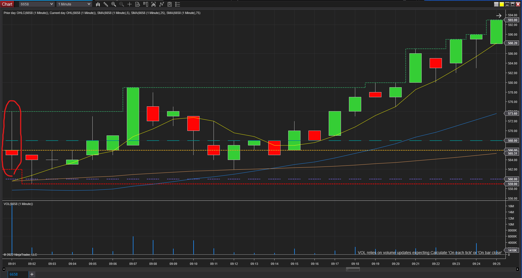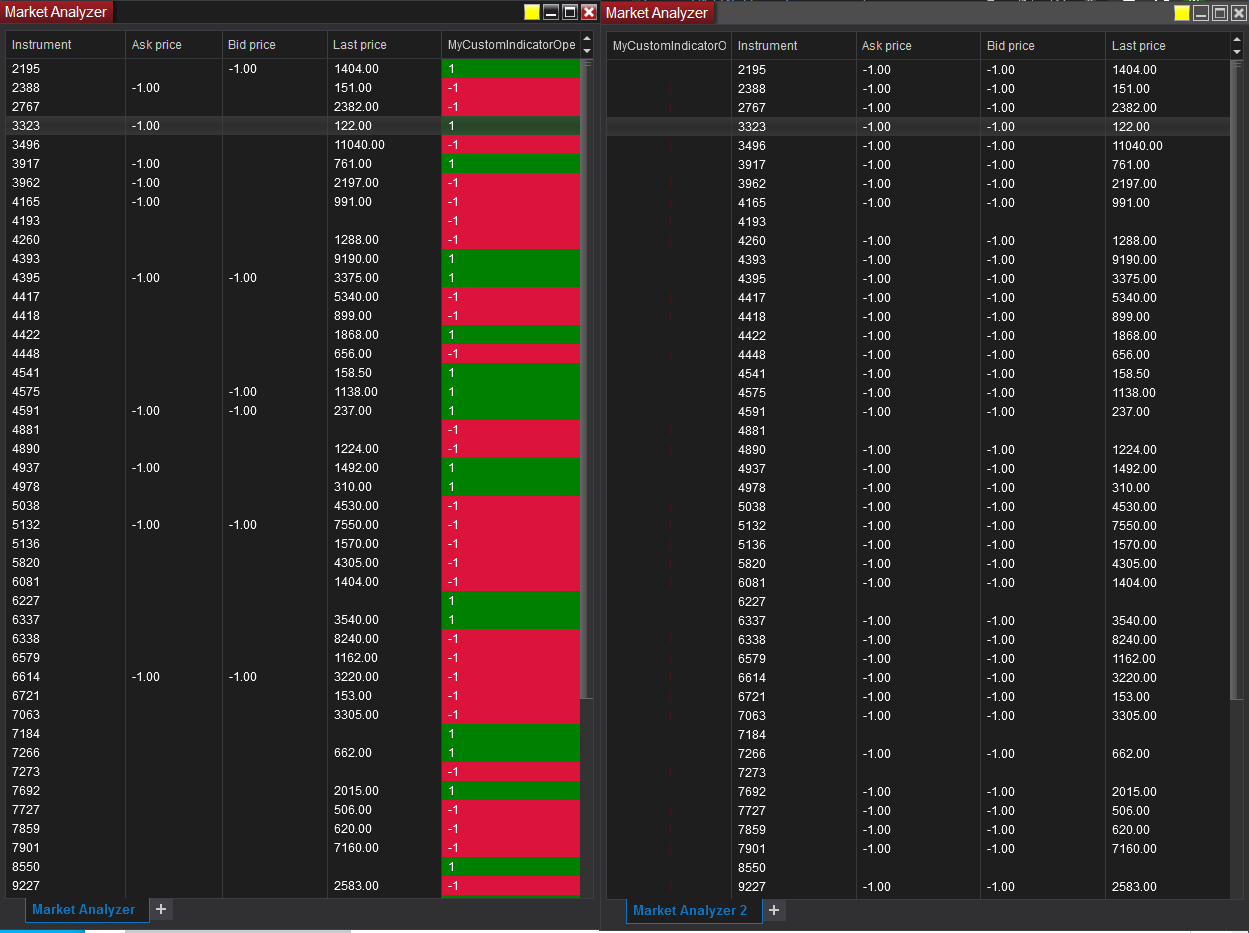 Here is what it looks like if I apply it to the Market Analyzer as a bar graph:Code:private Series<double> openBar; private bool positiveOpen; protected override void OnStateChange() { if (State == State.SetDefaults) { AddPlot(new Stroke(Brushes.Black, 2), PlotStyle.Bar, "OpenBarPlot"); } else if (State == State.DataLoaded) { openBar = new Series<double>(this); } } protected override void OnBarUpdate() { if (CurrentBar < 1) return; if (Bars.IsFirstBarOfSession && Close[0] > Open[0]) positiveOpen = true; if (Bars.IsFirstBarOfSession && Close[0] < Open[0]) positiveOpen = false; if (positiveOpen == true) openBar[0] = 1; if (positiveOpen == false) openBar[0] = -1; OpenBarPlot[0] = openBar[0]; if (openBar[0] > 0) PlotBrushes[0][0] = Brushes.LimeGreen; else if (openBar[0] < 0) PlotBrushes[0][0] = Brushes.Red; else PlotBrushes[0][0] = Brushes.Black; }