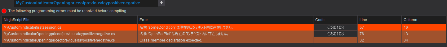Code:名前空間 NinjaTrader.NinjaScript.Indicators { public class MyCustomIndicator : Indicator { [Browsable(false)] [XmlIgnore] public Series<double> OpenBarPlot { get { return Values[0]; } } プライベート Series<double> openBar; private bool positiveOpen; protected override void OnStateChange() { if (State == State.SetDefaults) { Description = @"新しいカスタム インジケーターの説明をここに入力してください。"; 名前 = "MyCustomIndicator"; 計算 = Calculate.OnBarClose; IsOverlay = false; DisplayInDataBox = true; DrawOnPricePanel = true; DrawHorizontalGridLines = true; DrawVerticalGridLines = true; PaintPriceMarkers = true; ScaleJustification = NinjaTrader.Gui.Chart.ScaleJustification.Right; //新しい市場データ イベントごとに累積するカスタム値が指標に必要な場合は、このプロパティを無効にします。 //詳細については、ヘルプ ガイドを参照してください。 IsSuspendedWhileInactive = true; //AddPlot(Brushes.Orange, "My"); AddPlot(new Stroke(Brushes.Black, 2), PlotStyle.Bar, "OpenBarPlot"); } else if (State == State.DataLoaded) { openBar = new Series<double>(this); } } 保護されたオーバーライド void OnBarUpdate() { if (CurrentBar < 1) return; if (Bars.IsFirstBarOfSession && Close[0] > Open[0]) ポジティブオープン = 真; if (Bars.IsFirstBarOfSession && Close[0] < Open[0]) positiveOpen = false; if (positiveOpen == true) openBar[0] = 1; if (positiveOpen == false) openBar[0] = -1; OpenBarPlot[0] = openBar[0]; if (openBar[0] > 0) PlotBrushes[0][0] = Brushes.LimeGreen; そうでなければ (openBar[0] < 0) PlotBrushes[0][0] = Brushes.Red; そうでなければ PlotBrushes[0][0] = Brushes.Black; // カスタム インジケーター ロジックをここに追加します。 } #領域プロパティ [Browsable(false)] [XmlIgnore] public Series<double> My { get { return Values[0]; } } #エンドリージョン } }Last edited by ラリー; 11-29-2022, 05:09 AM.