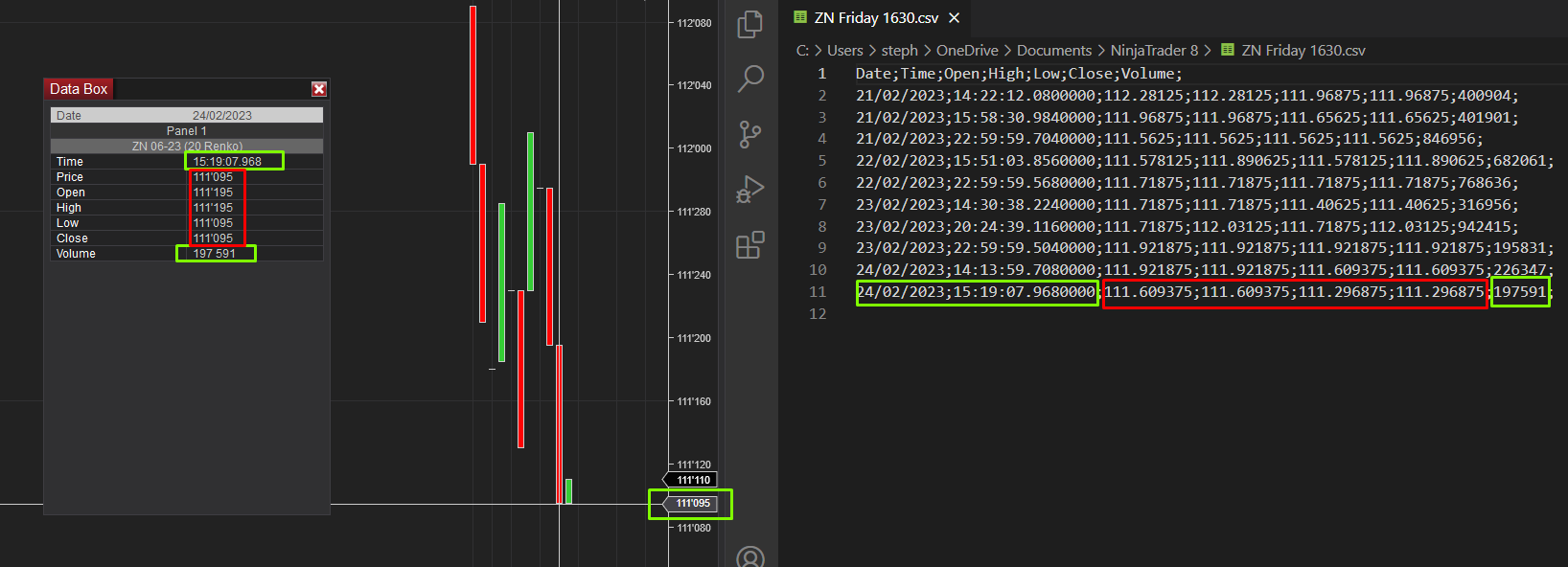 The pb is that prices saved with renko are not correct. The date and volume and indicators values are good..