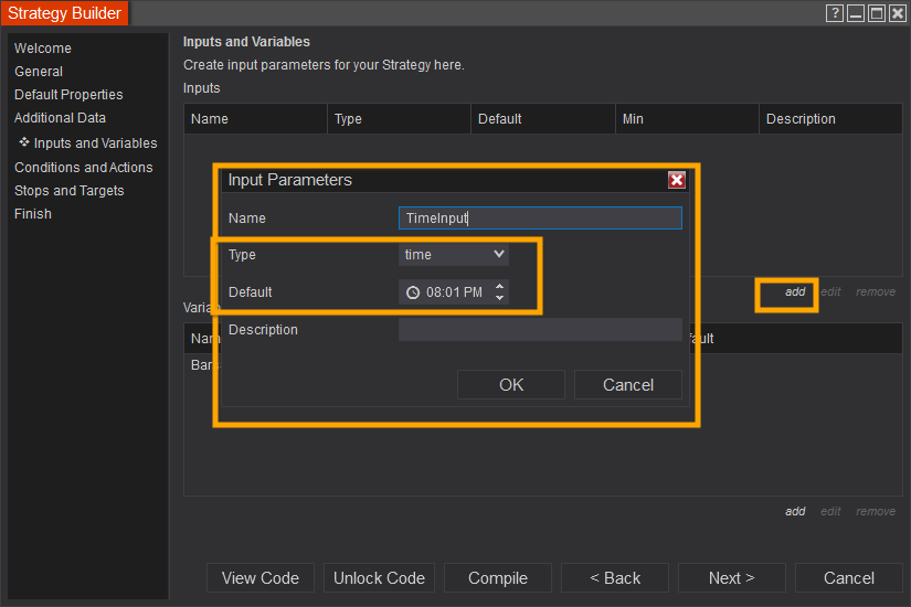 That said, user-defined Time inputs could be created on the Inputs section of the Inputs and Variables Screen of the Strategy Builder. See this attached screenshot.