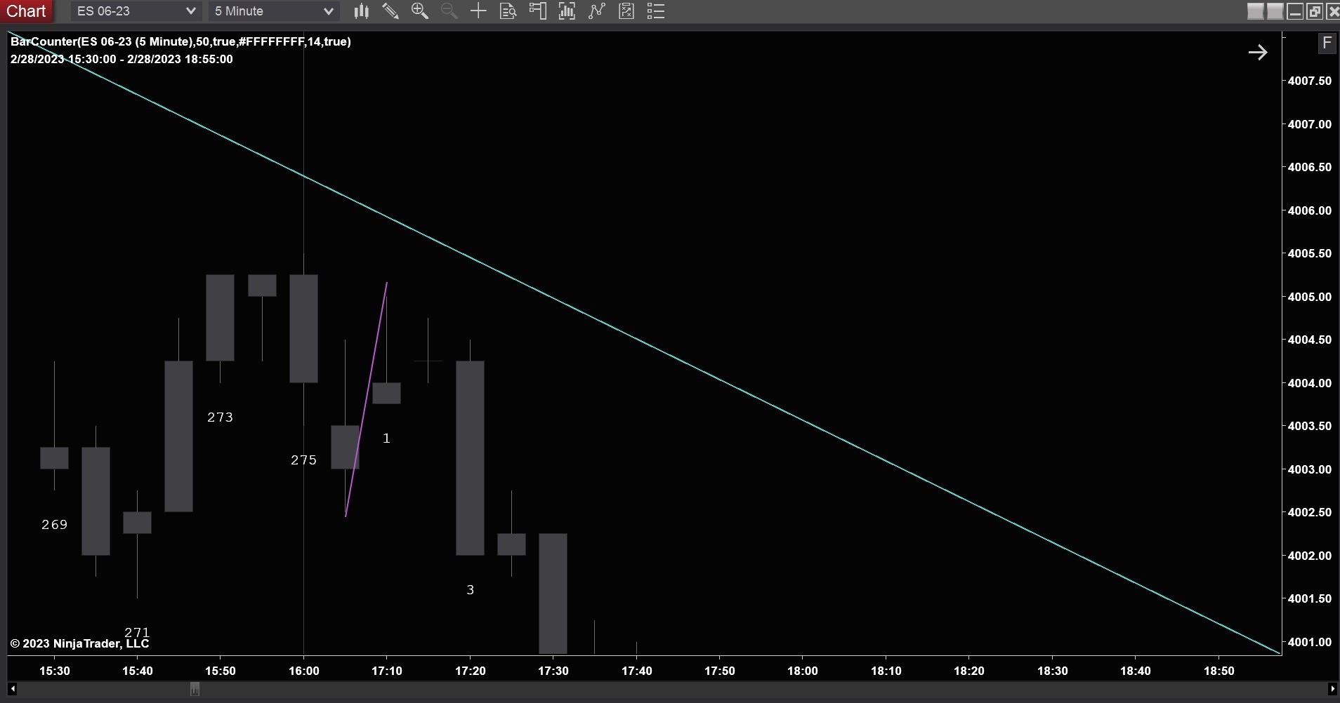 In the picture provided, the purple line is drawn after bar 1 has finished printing. On the DrawLine() method, "TrendsLastBarsAgo" = current session's first bar number (0) - Bars.BarsSinceNewTradingDay, "LastLow" = Low[TrendsLastBarsAgo], and the rest of the coordinates are pretty obvious.