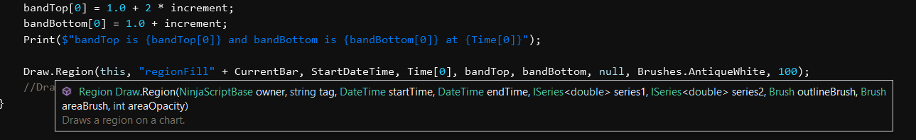 I am also struggling to get the Draw.Region() to show in Panel 2. Where is the example script from Post #7? I have created the custom series, set DrawOnPricePanel = false and set the MaximumBarsLookBack for the Series' to Infinite. All values are looking good when printing debug statements and when I double click other drawings my "regionFill" objects are showing in the 'Drawing Objects' window but not displaying. I have tried the many different options of Draw.Region() trying to get it to display.