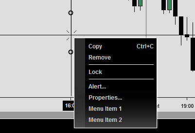 The DrawingToolContextMenuExample drawing tool can be added to a chart by clicking the drawing tool menu on the chart titlebar and selecting DrawingToolContextMenuExample.