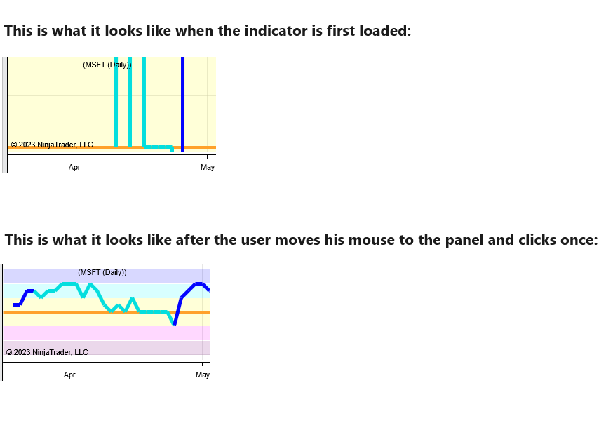 Based on your description, this may be a symptom of the IsSuspendedWhileInactive property. Please try setting IsSuspendedWhileInactive to false in OnStateChange() when the state is State.SetDefaults or State.Configure and see if this resolves the behavior.- I get the same result as before. Just to give you a visual example, I'm including the before and after in a picture below.Code:IsSuspendedWhileInactive = false;