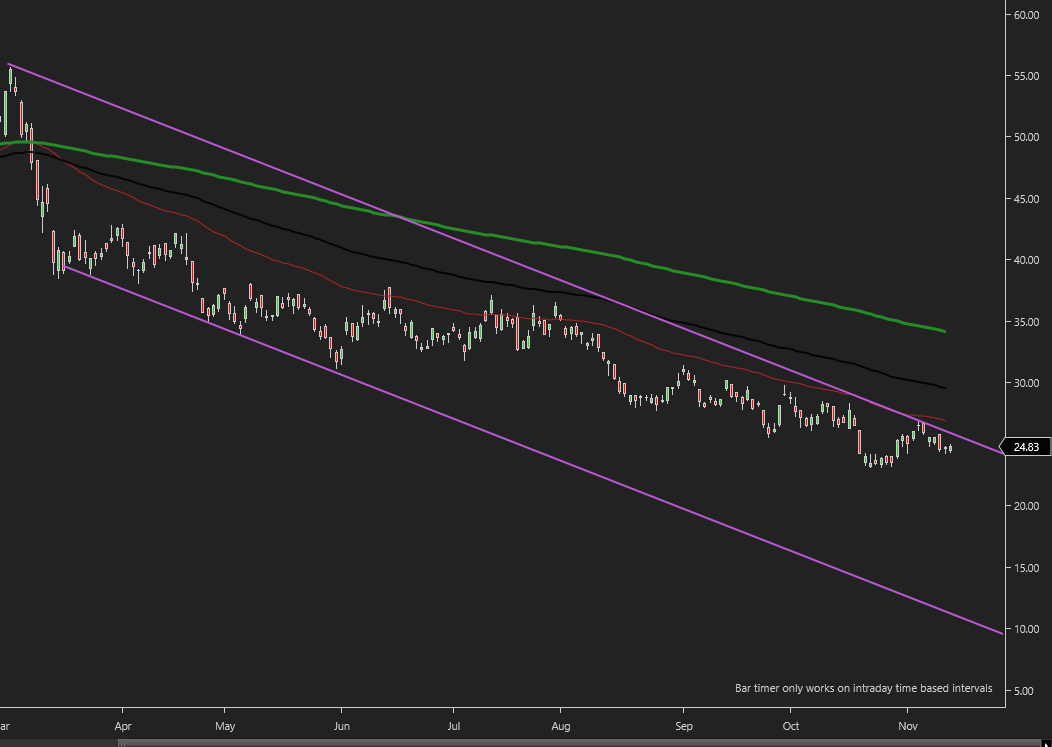 ( this way the upper trendline always attaches to the same original anchor point on the left side of the chart. But on the right side it anchors to the most recent high that crossed the trend line on its prior anchor values).
