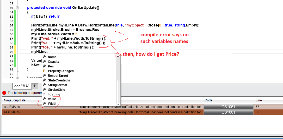 Hi I am new to programming, I was looking at the Draw.HorizontalLine() method. I wanted to create the object with specified width/brush as well as setting it a global drawing object. I don't see it fits one of the available syntax and if I try to set like width or global like object.isGlobal = True separately after the ojbect is created, ninjatrader compiler does not like that. What do I do?