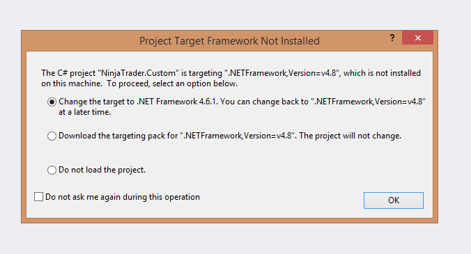 When VS opens it, it tells me that the C# project "NinjaTrader.Custom is targeting ".NETFramework, Version=v4.8", which is not installed on this machine.