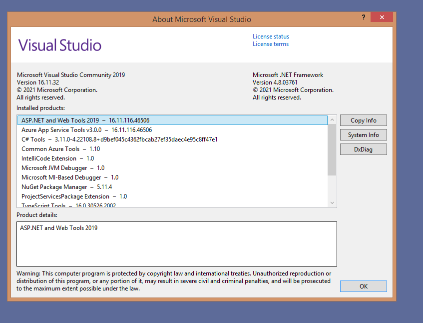 I'm attaching the VS about the screen. You will see that .NET Framework 4.8.03761 is installed.