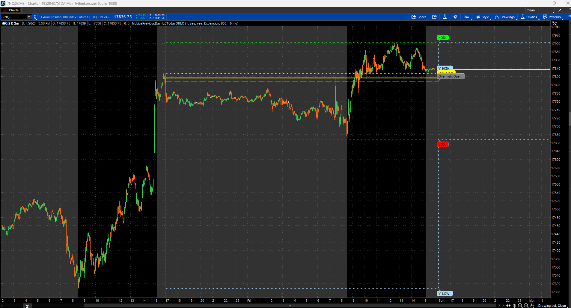 Ninja's built in previous day OHLC and current day OHLC begin plotting at midnight. As we know, the futures new trading day begins 5PM CST and not midnight. I have a thinkscript I use on thinkorswim that plots all this for me and has chart bubbles to identify the lines with the ability to set colors etc. It would be cool if some genorus thinkscript developer would take this close and make a ninjascript that will do the same. Code is attached.