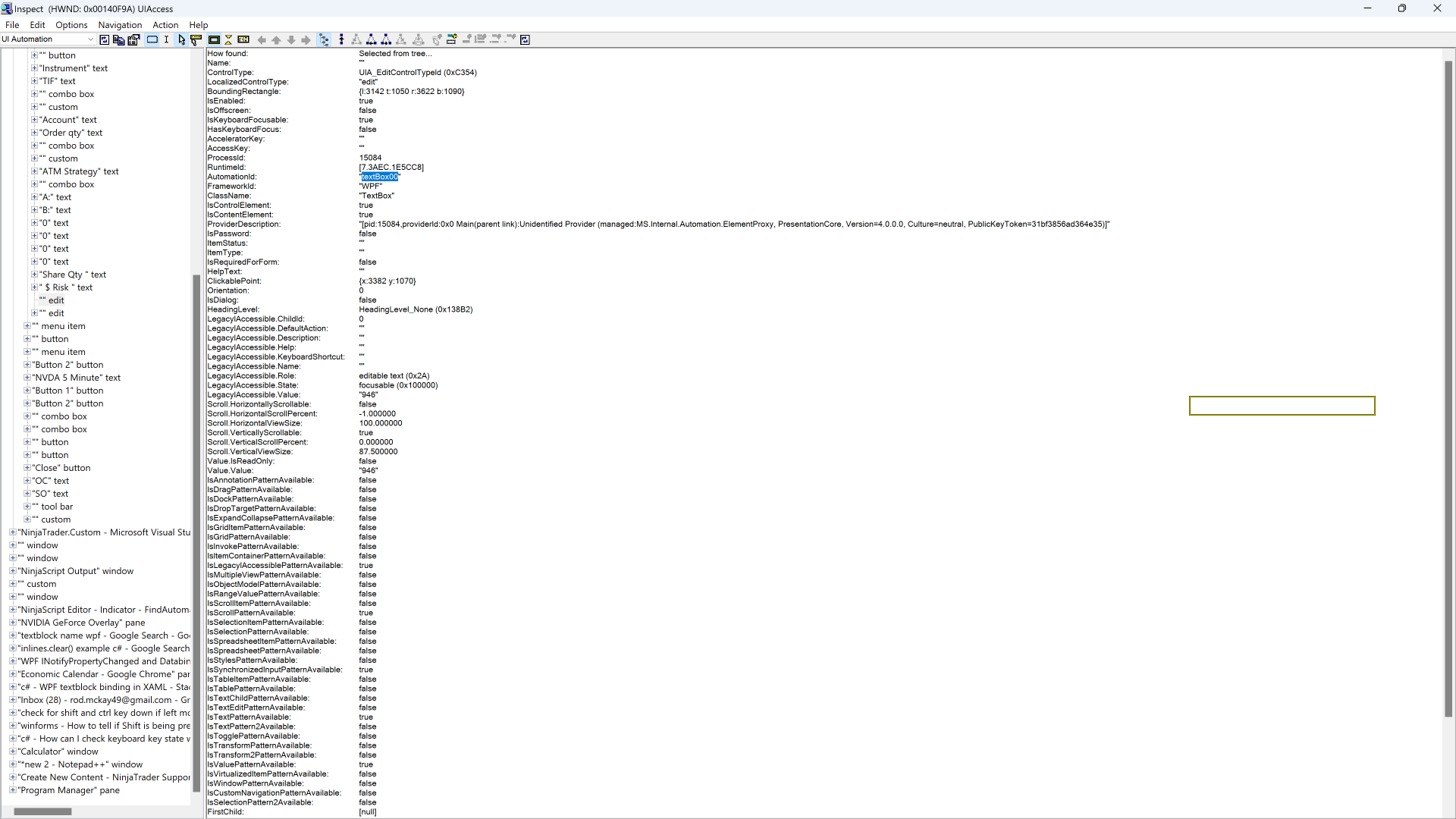 The answer is no. I had not set automation IDs. I added them and did repeated queries to locate the TextBoxes. For some reason, locating the controls is intermittent. The TextBoxes were placed into a grid which is added to the ChartTrader Grid. I gave the grid a UI ID as well. The location problem may have been related to running Snoop and Inspect repeatedly. NT often crashes when either of the apps are running. Will let you know if further problems develope.