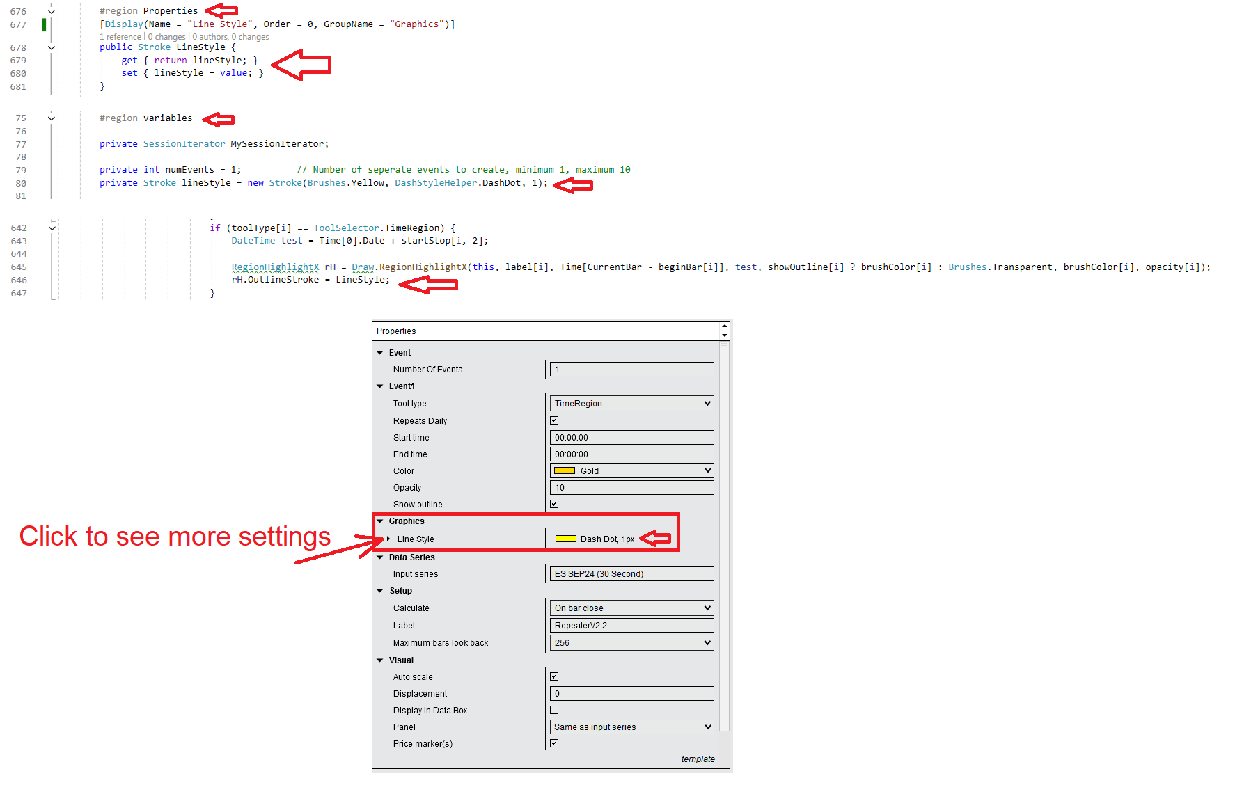 Code:if (toolType[i] == ToolSelector.TimeRegion) { DateTime test = Time[0].Date + startStop[i, 2]; RegionHighlightX rH = Draw.RegionHighlightX(this, label[i], Time[CurrentBar - beginBar[i]], test, showOutline[i] ? brushColor[i] : Brushes.Transparent, brushColor[i], opacity[i]); rH.OutlineStroke = new Stroke(brushColor[i], DashStyleHelper.DashDot, 1); }