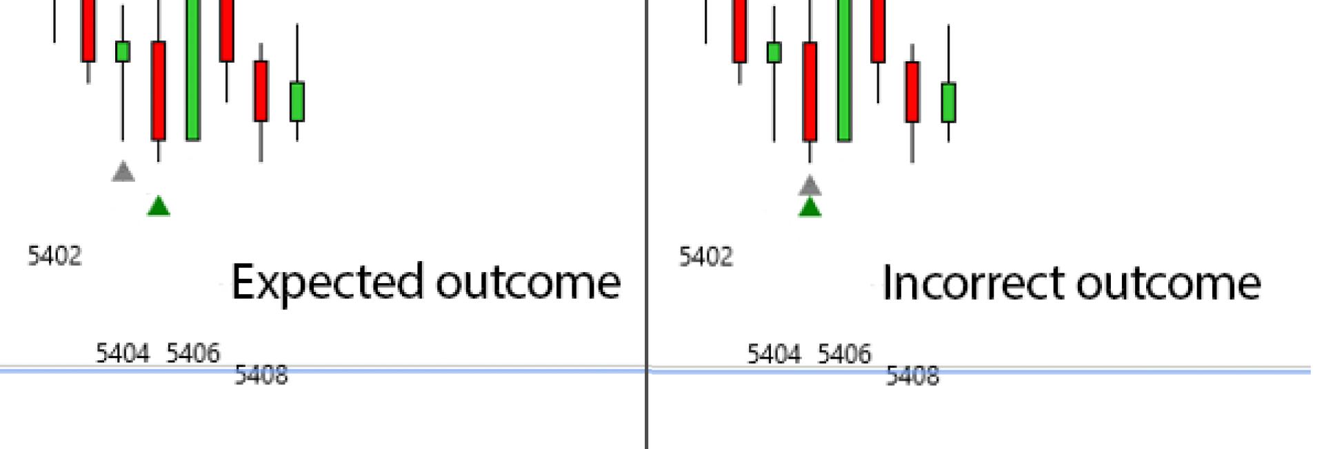 Please see screenshot. (Please ignore the green triangle, I omitted the code for that here). In essence, Bar 5405 is the trigger bar and here code runs that should draw a grey unicode triangle under the signal bar, in this case the signal bar is the prior bar, 5404.
