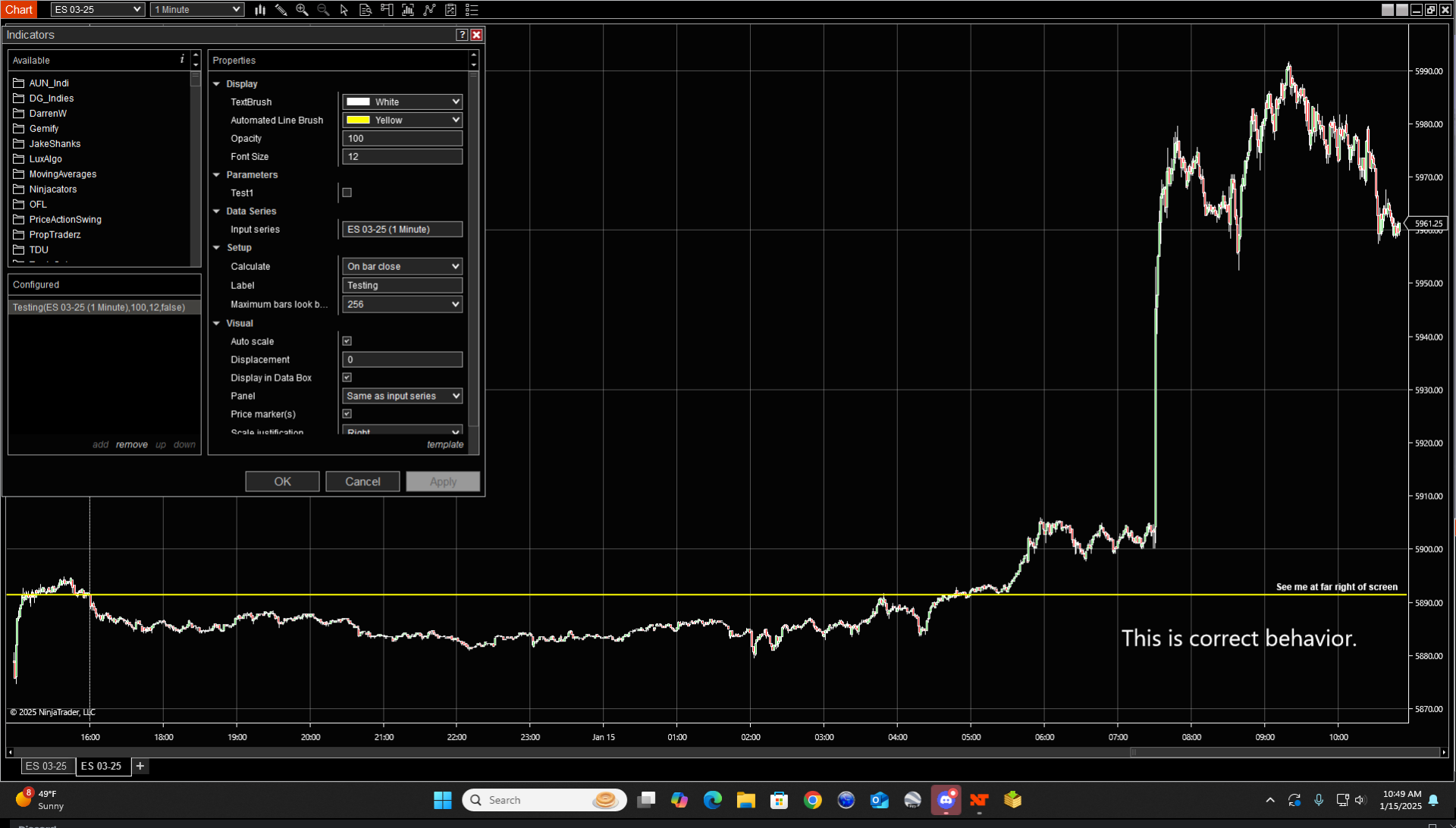 1/9/2025 5:03:00 PM | Close[0]: 5944.5 == PriorDayOHLC1.PriorClose[0]: 0 && Test1: True == true || Test1: True == false​