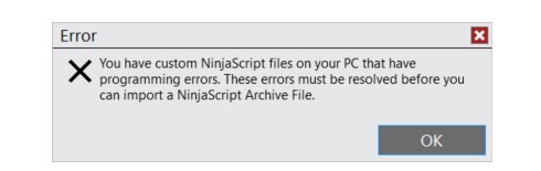 This message indicates that there are NinjaScript errors on your platform that need to be resolved before you can import or edit any others. To begin resolving this, do the following:- Go to the Control Center > New > NinjaScript Editor