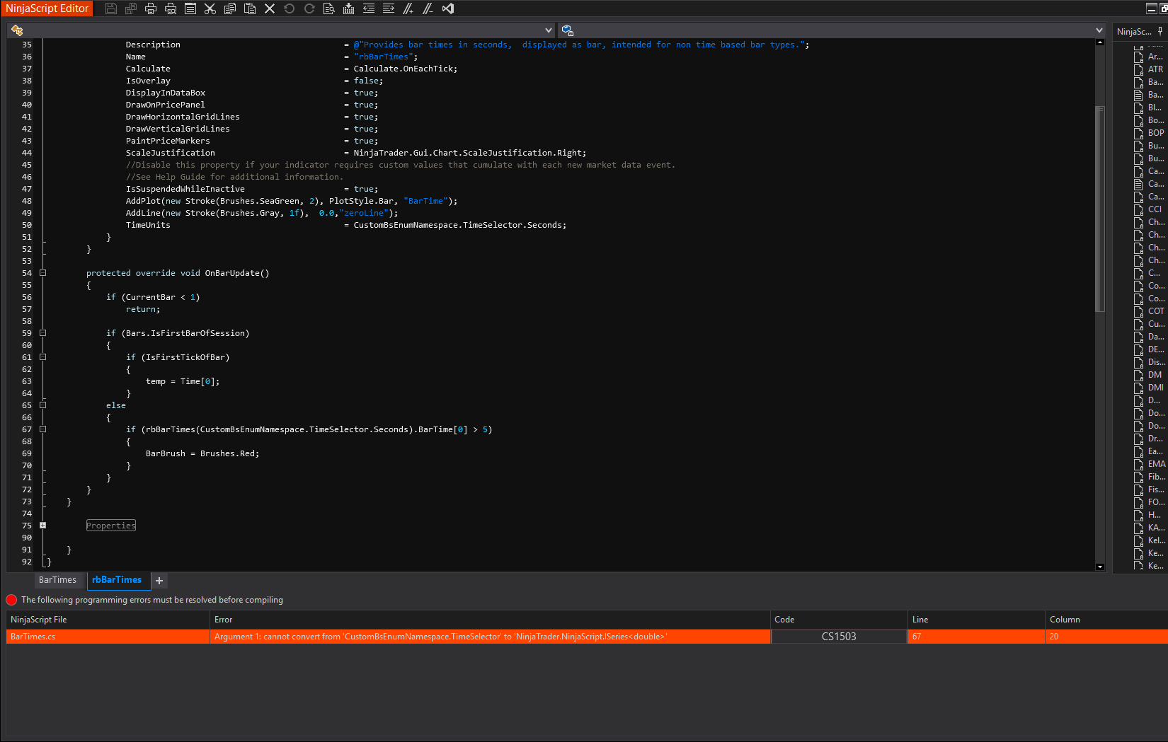 May I have a screenshot of the NinjaScript Editor showing the entire window including the error message and line of affected code to confirm?