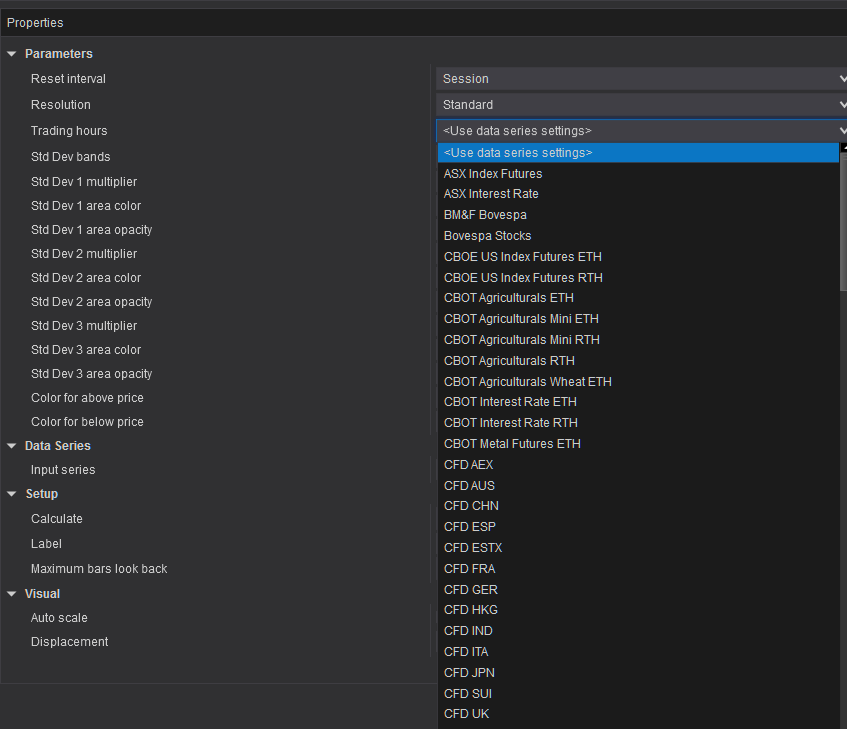 The primary series of the indicator will always be the primary series of the input series (chart bars) and will use the Trading hours selected for the chart data series in the Data Series window.