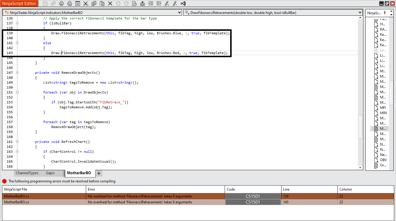I believe the issue is with the number of parameters I'm passing. Could you clarify the correct parameter structure for Draw.FibonacciRetracements in NinjaTrader 8? Also, how can I apply a custom template like "Range Bar Thick BL" or "Range Bar Thick" to these Fibonacci retracements?