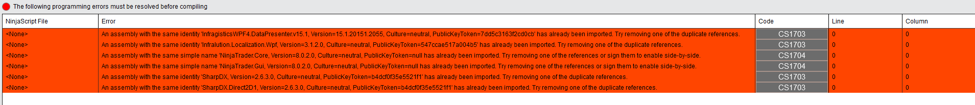 Can you please right click in the code window and select References. Delete any duplicate references. Subsequently compile your NinjaScript files and check if they compile without error.