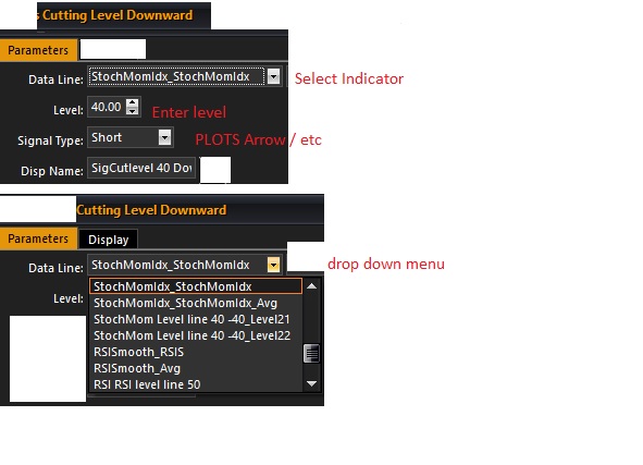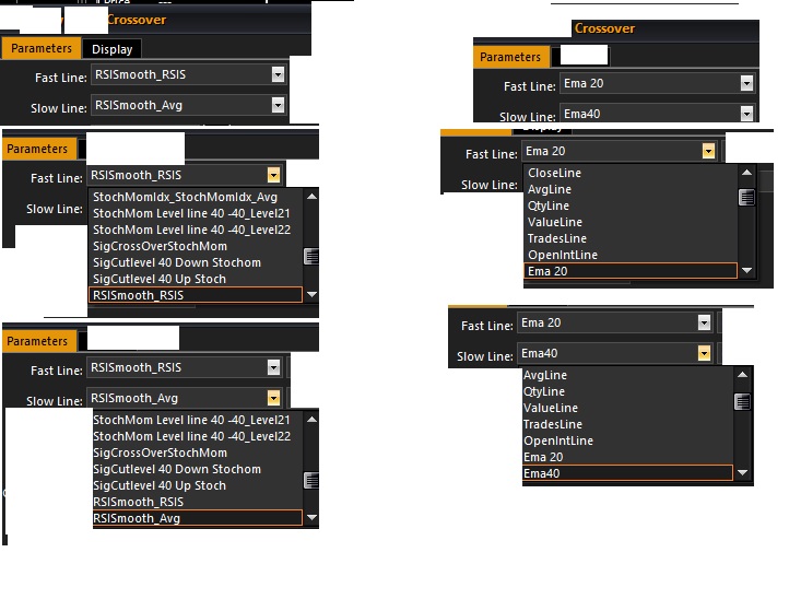 if we have plotted any indicator on chart then it lets us select from dropdown menu...no need to enter parameters( any numericals ) for any of the indicators...just select the indicator foo crossover.