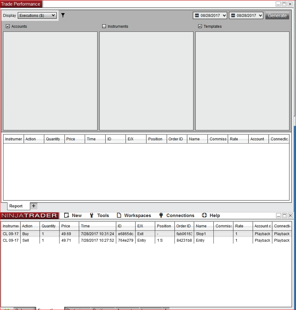 Update - I see what is happening When I insert a strategy on the chart all manually placed orders disappear( Markers and text). If the strategy is disabled they do not come back nor does the trade performance information . Using Sim101 and placing manual trades at least the performance information is retained after removing the Strategy.
