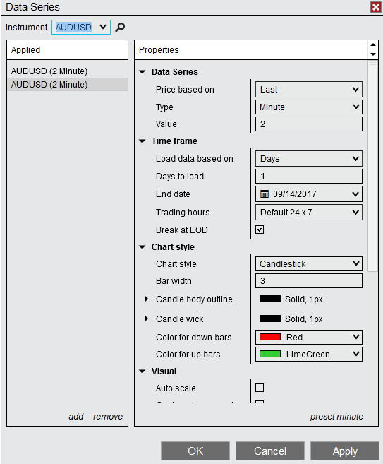 After you add the first instrument in the Data Series menu, please click once in the Instrument field. Subsequently hit Enter on your keyboard. This will add a 2nd instance of the same data series.