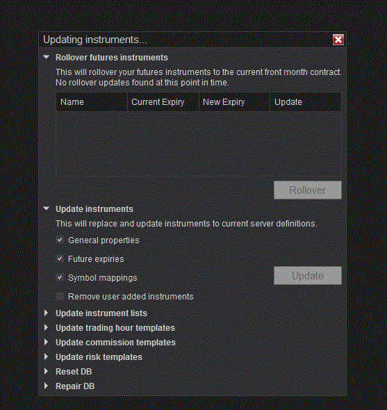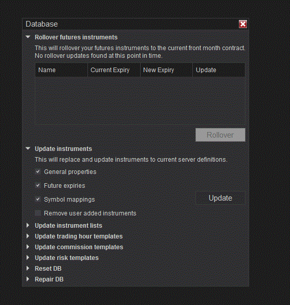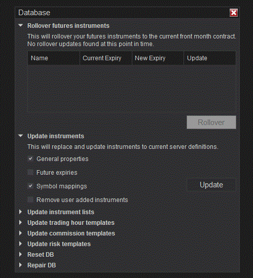 3. In the Database Management window, under the “Update instruments” section, ensure that “General properties”, "Futures expiries" and “Symbol mappings” options are checked and then click Update