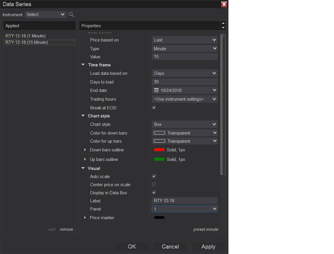 3. Once chart opens, right click and Data Series again. Add a second Data Series, RTY 12-18 and 15 Minutes.