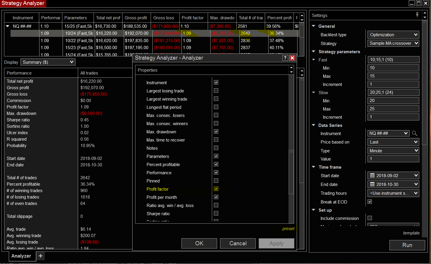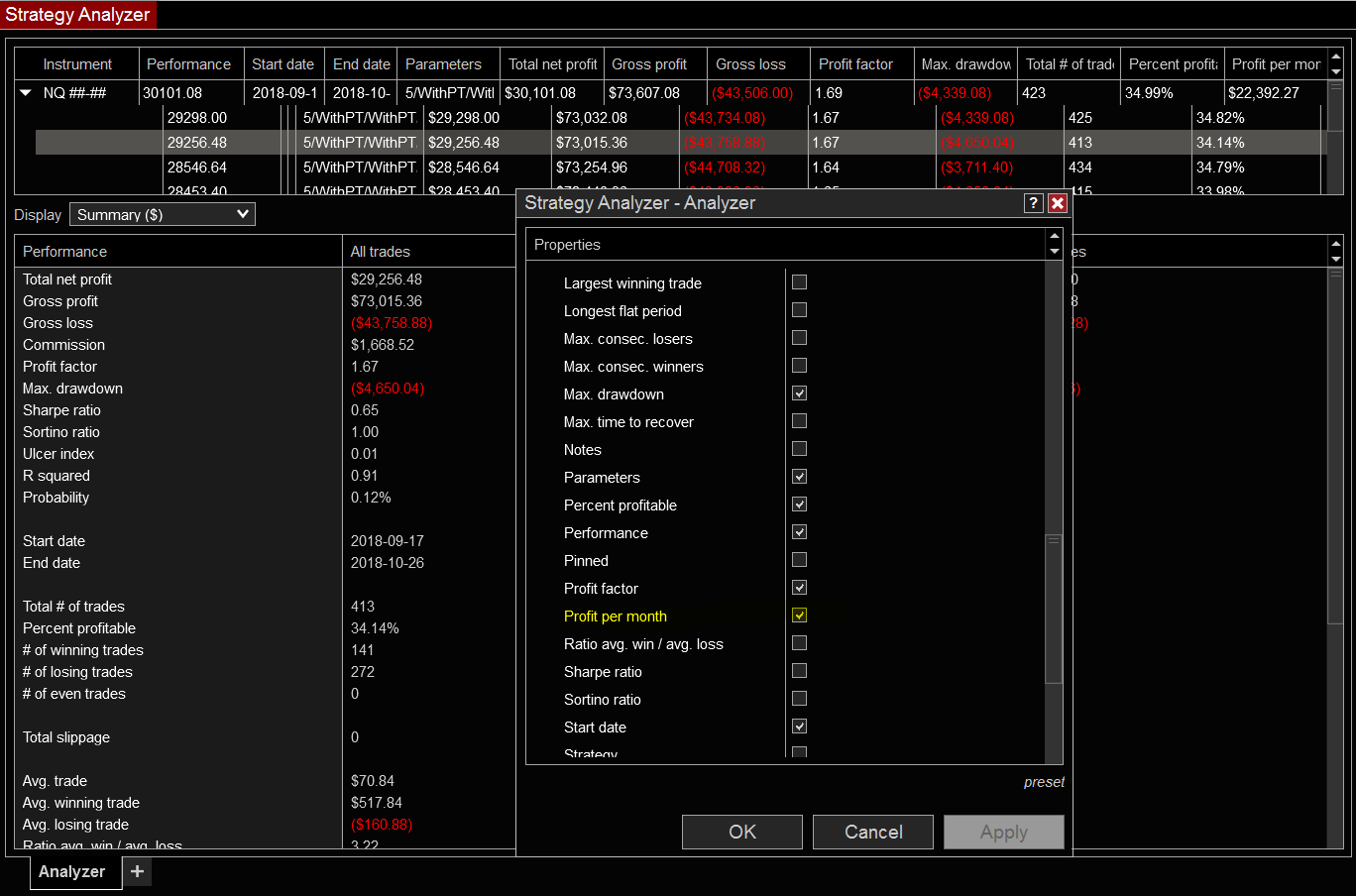• Once complete, right-click within the Strategy Analyzer > Properties > Enable 'Profit per month'