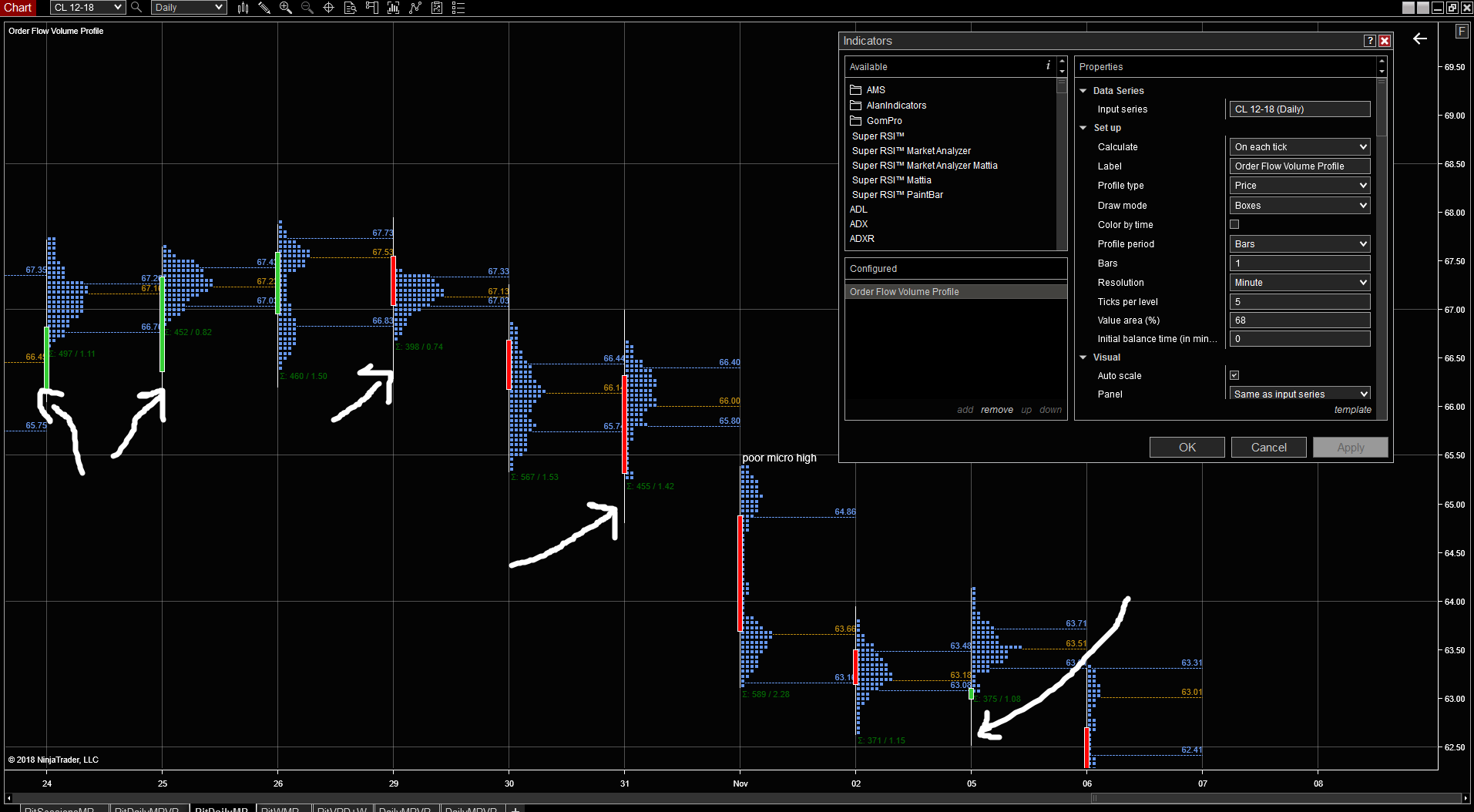 on your not sure why the profile is built on the right (after market close) and facing the right. Basically I'd like to have the profile as we built before but also on the same pannel/chart I need to be able to see the boxes for each price printed on each 30' during RTH (as standard practice on Market profile analysis). I did get to something like that as my post above but I still find the wrong Profile charted since the last 30' goes on the following day Profile.